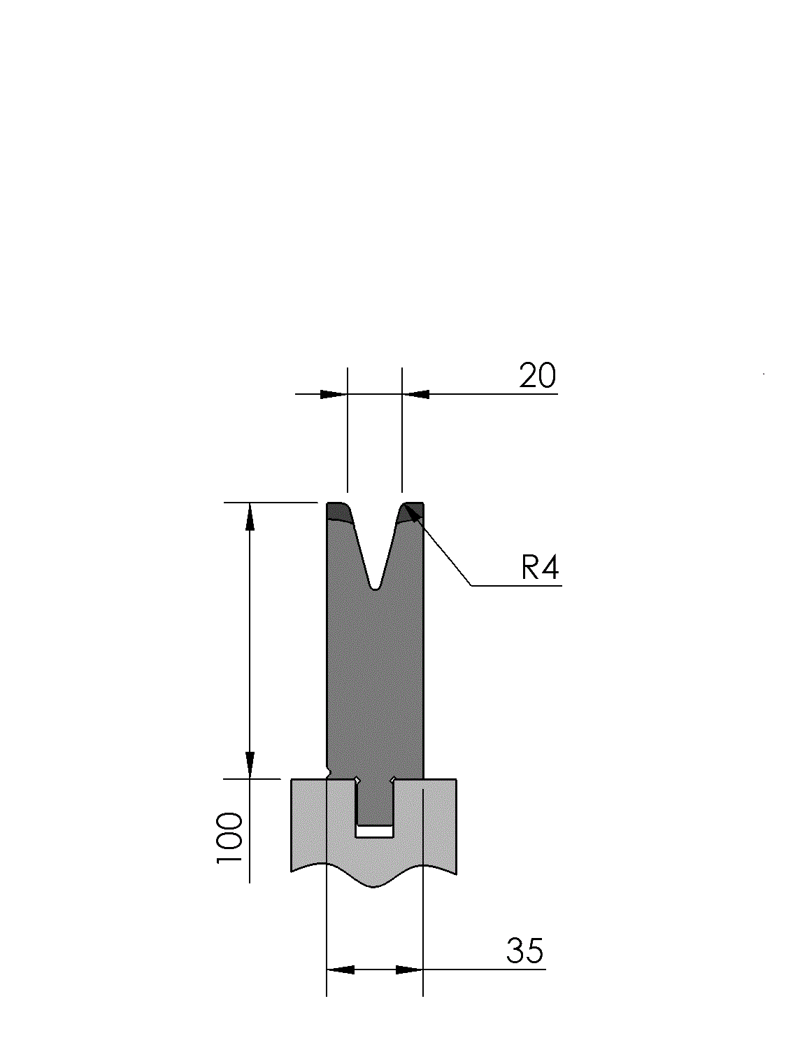 New Standard Premium bottom tool provided with ATC-adapter. Working height=100mm, V-opening=20mm/30°, Bending radius=4mm CNC-Deephardened® (at least 4mm / 56-60HRc), Material=CR-MO