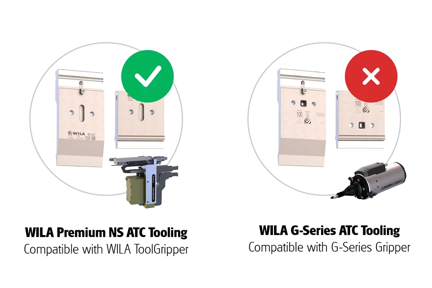 WILA Premium NS ATC Tools are only suitable for tool changers using the WILA NS ATC ToolGripper. The tools are incompatible with the classic WILA G-Series ATC Gripper.