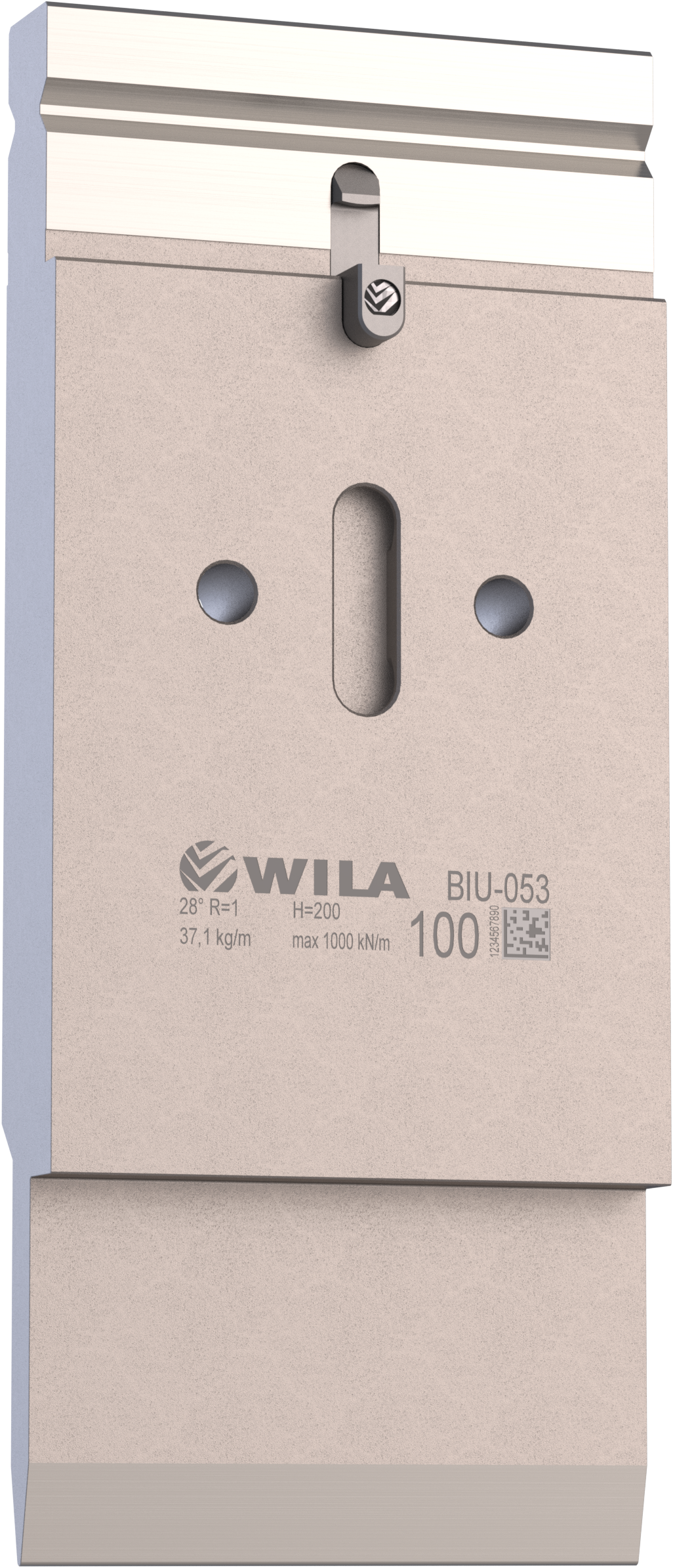 New Standard Premium top tool provided with WILA New Standard ATC, with Working height H=200mm, α=28°, Radius=1mm including flattening surface CNC-Deephardened® (at least 4mm / 56-60HRc), Material=CR-MO, Max. load=100ton/m. Provided with Safety-Clicks™, which allows you to change the tooling vertically.