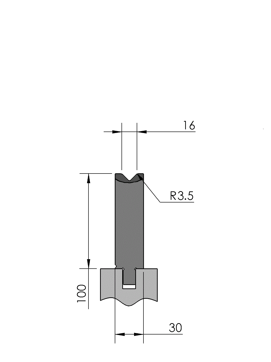 New Standard Premium bottom tool provided with WILA New Standard ATC, Working height=100mm, V-opening=16mm/90°, Bending radius=3.5mm CNC-Deephardened® (at least 4mm / 56-60HRc), Material=CR-MO