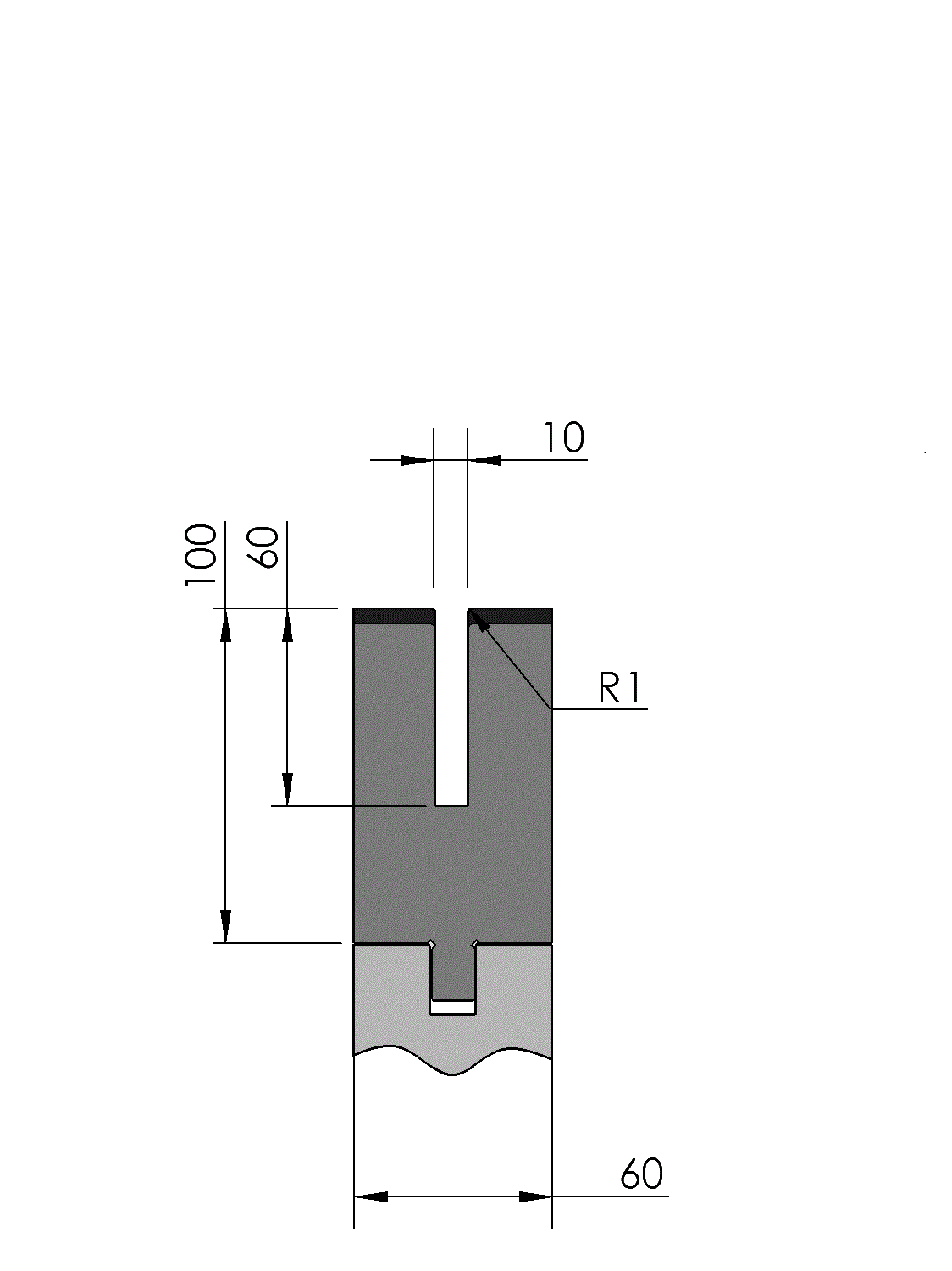 New Standard Premium bottom tool provided with WILA New Standard ATC, Working height=100mm, U-opening=10x60mm (BxD), Bending radius=1mm CNC-Deephardened® (at least 4mm / 56-60HRc), Material=CR-MO